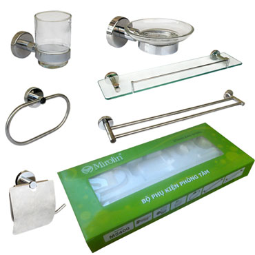 • Bộ phụ kiện Inox gồm 6 chi tiết bao gồm: Vòng vắt khăn, Thanh vắt khăn, Giá để cốc, Kệ kính, và kính dày 8 mm, Giá để xà phòng, Lô giấy vệ sinh.