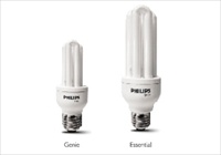 - Đèn tiết kiệm điện Philips (CFL) Essenital và Genie có giá rất cạnh tranh, đáp ứng yêu cầu của thị trường. Essential có 8W và 18W, Genie có 5W, 11W và 14W với ánh sáng vàng và ánh sáng trắng. Tất cả điều có chuôi E27 và dùng điện áp từ 220V-240V, 50Hz-60Hz. Tuổi thọ của bóng đèn là 6000 giò (3 năm nếu thắp sang 5.5 giò mỗi ngày với điện áp tiêu chuẩn ) và khởi động ngay. Các loại đèn này không dùng với bộ điều chỉnh độ sang.